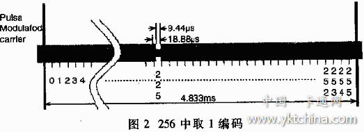 (1)數(shù)據(jù)編碼 從讀寫器到卡的數(shù)據(jù)采用脈沖位置調(diào)制即“1/256”編碼。用256個(gè)時(shí)隙表示8bit數(shù)據(jù),通過控制bit脈沖出現(xiàn)的時(shí)間位置來表示0~255范圍內(nèi)的數(shù)據(jù)。如圖2,在第255個(gè)位置出現(xiàn)的位置脈沖(9.44μs高電平的9.44μs低電平)表示數(shù)據(jù)E1(HEX),采用計(jì)數(shù)器加控制電路即可實(shí)現(xiàn)。控制部分協(xié)助實(shí)現(xiàn)數(shù)據(jù)無縫編碼及形成幀起始位和結(jié)束位,用VHDL設(shè)計(jì)易于實(shí)現(xiàn)。編碼后的數(shù)據(jù)進(jìn)行ASK調(diào)制(13.56MHz載波),經(jīng)天線發(fā)射出去。