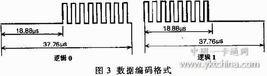 (2)數(shù)據(jù)譯碼 從射頻卡返回的數(shù)據(jù)經(jīng)過一次解調(diào)(去掉13.56MHz載波)后,數(shù)據(jù)編碼格式如圖3所示。可以直接進(jìn)行數(shù)據(jù)譯碼,也可以去除子載波(423.75kHz)后得到Manchester碼再譯碼。這里采用后者,通過在每一bit的前、后半段時(shí)間內(nèi)兩次取樣、判決、加以串并變換即可得到譯碼后的并行數(shù)據(jù)并送至并行CRC模塊進(jìn)行CRC校驗(yàn),同時(shí)送往單片機(jī)處理,行CRC模塊在校驗(yàn)結(jié)束時(shí)通知單片機(jī)取校驗(yàn)結(jié)果。