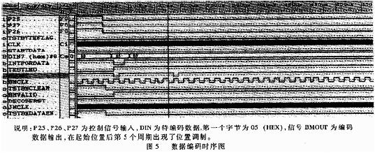 用AT89C51單片機(jī)提供編碼數(shù)據(jù)以及模擬待譯碼曼碼數(shù)據(jù)流對(duì)模塊功能進(jìn)行實(shí)測(cè),用示波器觀察各測(cè)試點(diǎn)信號(hào),結(jié)果基本上與時(shí)序仿真的波形圖相同,達(dá)到了預(yù)期設(shè)計(jì)的目標(biāo)。