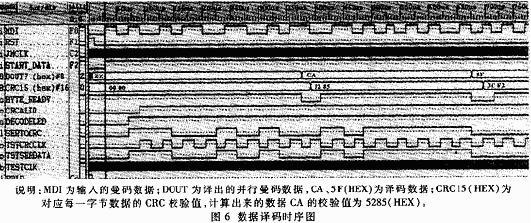 這里選用1片XILINX XC95144實(shí)現(xiàn)整個(gè)數(shù)據(jù)處理模塊的功能,使用軟件平臺(tái)是XILINX.htm" target="_blank" title="XILINX貨源和PDF資料">XILINX Foundation 3.1i。XC95144內(nèi)部有144個(gè)宏單元、3200可用門。圖5和圖6分別給出了編碼器和譯碼器的部分時(shí)序仿真結(jié)果及其說明。可以看到,二者均實(shí)現(xiàn)了協(xié)議要求,編碼器在準(zhǔn)確的位置實(shí)現(xiàn)脈沖位置調(diào)制,譯碼器能準(zhǔn)確地對(duì)曼徹斯特碼數(shù)據(jù)進(jìn)行譯碼,并計(jì)算出輸入數(shù)據(jù)的CRC值。