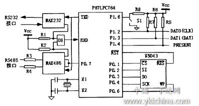 看門狗和系統(tǒng)參數(shù)存儲由x25043完成。該芯片內(nèi)含電源監(jiān)控、看門狗和可擦寫非易失存儲器, 保存通訊波特率、卡格式等參數(shù)。