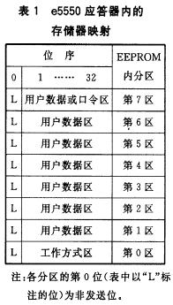 (4) 發(fā)射機(jī)應(yīng)答器上帶有EEPROM,共分8個(gè)(存儲(chǔ))區(qū),每區(qū)有33個(gè)位,故總共有264個(gè)位(見表1)。
