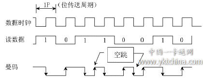根據(jù)我們得到的器件,采用曼碼調(diào)制的數(shù)據(jù),位數(shù)據(jù)"1"對(duì)應(yīng)著電平下跳,位數(shù)據(jù)"0"對(duì)應(yīng)著電平上跳(注意:Telefunken半導(dǎo)體公司提供的資料(Rev.A2,13-Oct-97)正好與此相反,故最好用前自己先測(cè)試一遍,切記!)。在一串傳送的數(shù)據(jù)序列中,兩個(gè)相鄰的位數(shù)據(jù)傳送跳變時(shí)間間隔應(yīng)為1P。若相鄰的位數(shù)據(jù)極性相同,則在該兩次位數(shù)據(jù)傳送的電平跳變之間,有一次非數(shù)據(jù)傳送的、預(yù)備性的(電平)"空跳"。