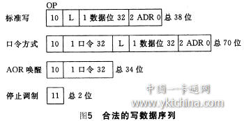 圖4寫操作時(shí)的信號(hào)流非接觸IC卡插入基站后,射頻線圈的耦合產(chǎn)生載波振蕩,利用兩次相鄰?fù)U裰g的不同時(shí)間間隔,區(qū)分位數(shù)據(jù)"1"和位數(shù)據(jù)"0"的編碼。停振間隙約在50~150域時(shí)鐘;位數(shù)據(jù)"0"的持續(xù)振蕩時(shí)間間隔為24域時(shí)鐘;位數(shù)據(jù)"1"的持續(xù)振蕩時(shí)間間隔為56域時(shí)鐘。當(dāng)停振間隙結(jié)束后,持續(xù)振蕩的時(shí)間間隔高于64域時(shí)鐘,則IDIC退出寫操作方式。