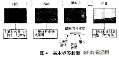 每個被RFID系統(tǒng)標(biāo)識的物品都對應(yīng)于一個標(biāo)簽。對應(yīng)十不同的應(yīng)用和環(huán)境,標(biāo)簽制造的方法和封裝形式都不同。藎本的組合步驟如圖4所示,前先是將不同導(dǎo)電材料(鋁、銅)做成的天線沉淀到一個慕底上,然后運用繞線或者翻片等技術(shù)將標(biāo)簽芯片連接到天線上,最后用PVC薄片、松香或者膠紙選擇性地做成保護層以支持其在特定環(huán)境物理中(摩擦、擠壓和腐蝕等)的應(yīng)用。