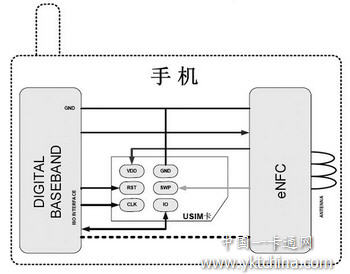 eNFC芯片組:eNFC芯片組與天線一起被設(shè)計(jì)在手機(jī)中,起到一個(gè)調(diào)制解調(diào)器的作用。它主要用來處理射頻RF協(xié)議本身,將射頻信號(hào)轉(zhuǎn)換為幀信號(hào)從SIM卡上的C6管腳傳送到SIM卡中,或者將從SIM卡同一管腳接收到的幀信號(hào)轉(zhuǎn)換為射頻信號(hào)。