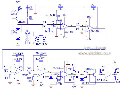 圖2給出了動(dòng)態(tài)車(chē)輛檢測(cè)電路原理圖。整個(gè)電路是由諧振電路、由用帶通和相加器組成的帶阻濾波器、同相直流放大器、遲滯比較電路和波形整形電路組成。基準(zhǔn)頻率的獲取直接影響測(cè)量精度,如果諧振電路的振蕩頻率較低,當(dāng)有不同類(lèi)型車(chē)輛經(jīng)過(guò)地感線圈時(shí),諧振電路輸出信號(hào)的波形形狀變化不大,只存在由于車(chē)輛底盤(pán)離地面高低不同而引起的微弱變化。這樣則大大減小了測(cè)量精度,使得判斷車(chē)輛通過(guò)的結(jié)果誤差很大。本 圖2動(dòng)態(tài)車(chē)輛檢測(cè)電路原理圖設(shè)計(jì)采用電容反饋三點(diǎn)式振蕩電路,將電路的起始基準(zhǔn)頻率設(shè)計(jì)在100KHz左右,工作頻率在100KHz—160KHz 之間都很穩(wěn)定,完全可以滿足交通部規(guī)定線圈的適用范圍(10Uh—2200Uh)。