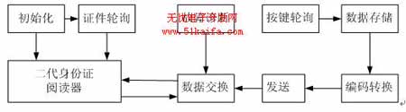 系統(tǒng)通過RS-232通信接口發(fā)送命令請(qǐng)求到第二代身份證閱讀器,讀出證件信息;經(jīng)過驗(yàn)證后,保存到智能采集器中;再等待系統(tǒng)定義的熱鍵按下,一旦有熱鍵按下,智能采集器將相應(yīng)的信息取出;處理之后發(fā)送到PC機(jī)的PS/2鍵盤接口,在光標(biāo)閃爍處顯示相應(yīng)信息。