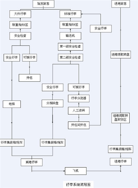 行李處理系統(tǒng)主要完成機(jī)場出港旅客行李托運(yùn)包括:值機(jī)、運(yùn)輸、安檢、引導(dǎo)方向、分揀,以及進(jìn)港旅客行李運(yùn)輸和提取等工作。