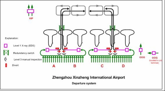 鄭州新鄭機(jī)場行李處理系統(tǒng)是一套高度自動化的系統(tǒng),它與包括旅客、值機(jī)人員,行李搬運(yùn)人員、還有機(jī)場方提供的安檢設(shè)備等構(gòu)成了一個(gè)完整的旅客托運(yùn)和提取行李的過程。鄭州新鄭機(jī)場行李處理系統(tǒng)(BHS)就是這樣一個(gè)行李處理系統(tǒng),行李處理系統(tǒng)(BHS)主要分為離港行李處理系統(tǒng)和進(jìn)港行李處理系統(tǒng)兩部分。其中,離港行李處理系統(tǒng)采用集中安檢方式。行李的輸送和分流由輸送機(jī)、分流器完成,行李條碼的閱讀由手持掃描儀或鍵盤完成。進(jìn)港行李處理系統(tǒng):行李處理系統(tǒng)進(jìn)港行李直接由行李提取轉(zhuǎn)盤輸送。大件行李由電梯輸送。