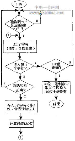 這里存在如何檢測(cè)、界定時(shí)鐘周期的起始位置、中間位置問(wèn)題,各種卡的做法并不一致.H4001沒(méi)有專(zhuān)門(mén)的硬同步信號(hào),不能檢測(cè)特殊信號(hào)作為起始標(biāo)志,而是規(guī)定64位數(shù)據(jù)位的前9位固定為全“1”,最后1位設(shè)定為“0”,作為起始和結(jié)束標(biāo)志或設(shè)定為同步信息.分析連續(xù)的若干位“1”和連續(xù)若干位“0”,其波形非常相似,所以實(shí)際解碼時(shí),應(yīng)該先檢測(cè)到1位“0”,再接著檢測(cè)連續(xù)的9位“1”,那么可以肯定,后續(xù)的54 個(gè)信息位便是40位真正的數(shù)據(jù)和14位相關(guān)的奇偶校驗(yàn)位,有關(guān)數(shù)據(jù)排列順序見(jiàn)文獻(xiàn)[4].可以想象,這里不應(yīng)該實(shí)際上也不可能再次出現(xiàn)1位“0”后跟隨連續(xù)的9位“1”.接下來(lái)是最后1位,必須是“0”,如此繼續(xù)下一循環(huán),否則便是出錯(cuò).為了提高效率,可以在循環(huán)內(nèi)邊檢測(cè)校驗(yàn),邊解碼保存H4001卡的信息,其程序流程如圖4所示.