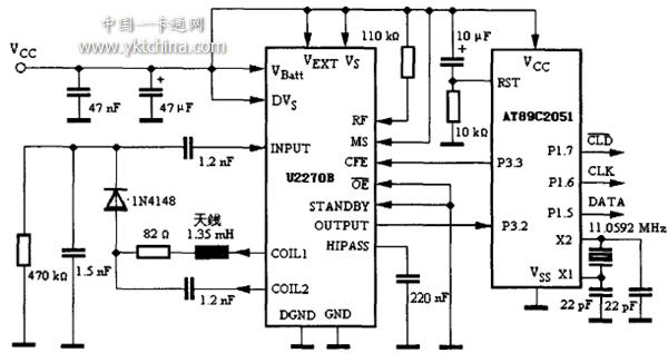 射頻卡的讀寫(xiě)需要由射頻卡基站芯片來(lái)完成數(shù)據(jù)的調(diào)制、發(fā)射和射頻的接收以及數(shù)據(jù)的解調(diào)任務(wù).ATMEL公司生產(chǎn)的U2270B是一種低成本、性能完善的低頻(100—150 kHz)射頻卡基站芯片,采用Man—chester編碼和雙相編碼,可用于讀取H4001 RFID卡.參照文獻(xiàn)[3]和[5],針對(duì)H4001 RFID卡,采用U2270B設(shè)計(jì)的射頻識(shí)別卡讀取模塊的電路見(jiàn)圖3.