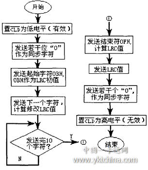 無(wú)數(shù)據(jù)輸出時(shí),/CLD信號(hào)應(yīng)一直為高電平,檢測(cè)到正確卡號(hào)后準(zhǔn)備發(fā)送數(shù)據(jù)時(shí)把它置低,并維持到發(fā)送過(guò)程結(jié)束;CLK信號(hào)線(xiàn)在延時(shí)3—5 ms后開(kāi)始以設(shè)定的頻率發(fā)出占空比為50% 的方波(時(shí)鐘),直到全部發(fā)送完畢;DATA在具體數(shù)據(jù)的前后,要發(fā)送5位以上“0”,作為同步信號(hào),起始標(biāo)志0BH(加校驗(yàn)位,發(fā)送順序ll010),數(shù)據(jù)之后發(fā)送結(jié)束標(biāo)志0FH(加校驗(yàn)位,發(fā)送順序11 1 11),5位LRC,還有5位以上“0”.⋯0’的表示方法是在CLK上半周結(jié)束前,把DATA線(xiàn)置高,一直維持到下一CLK周期;“1”則是在CLK上半周結(jié)束前,把DATA線(xiàn)置低,一直維持到下一CLK周期.