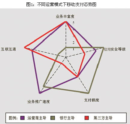 移動(dòng)支付產(chǎn)業(yè)價(jià)值鏈主要由銀行、移動(dòng)運(yùn)營(yíng)商、移動(dòng)支付服務(wù)提供商(第三方)、商家和用戶構(gòu)成。在當(dāng)前移動(dòng)支付業(yè)務(wù)運(yùn)作中主要有以移動(dòng)運(yùn)營(yíng)商為運(yùn)營(yíng)主體、以銀行為運(yùn)營(yíng)主體和以第三方為運(yùn)營(yíng)主體的三種模式。圖1描述了不同運(yùn)營(yíng)模式下,移動(dòng)支付在業(yè)務(wù)豐富度、信用安全等級(jí)、支付額度、業(yè)務(wù)推廣速度和不同銀行間互聯(lián)互通等5個(gè)維度上的不同態(tài)勢(shì)。