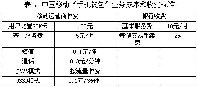 用戶是移動(dòng)支付業(yè)務(wù)的最終消費(fèi)者,也是移動(dòng)支付產(chǎn)業(yè)鏈中最重要和最基礎(chǔ)的環(huán)節(jié)。用戶除對(duì)移動(dòng)支付的安全性、私密性和易用性有所擔(dān)心外,對(duì)移動(dòng)支付業(yè)務(wù)的成本和較高收費(fèi)也難以接受。以中國(guó)移動(dòng)的“手機(jī)錢包”業(yè)務(wù)為例,其成本和收費(fèi)標(biāo)準(zhǔn)見表2。