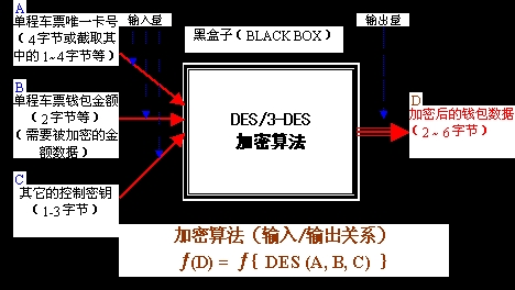 如果要求加密的錢包金額數(shù)據(jù)B=0x10(元),而該張單程車票的唯一卡號為A=0x0001, 控制密鑰為C=0xFFFF,則該張單程車票的加密后的錢包數(shù)據(jù)D(可能)=0x1a2b3c;(注意,一般從數(shù)據(jù)D是不可能推倒出數(shù)據(jù)輸入量B的準(zhǔn)確值的,這是由DES加密算法的“不可逆推特性”所決定的,否則不能作為加密算法!)