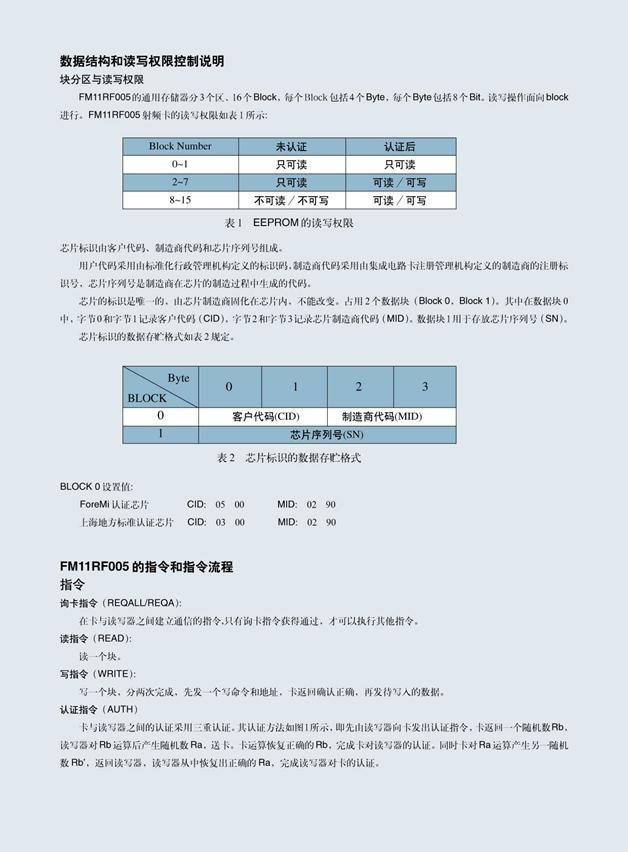 塊0、塊1是特殊的數(shù)據(jù)塊,用于存放制造商代碼(MID)、客戶代碼(CID)、唯一序列號(UID),稱制造商塊。制造商塊中的數(shù)據(jù)由芯片制造商在生產(chǎn)過程中寫入,數(shù)據(jù)只讀,不可改寫。