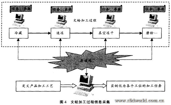 隨著人們對(duì)食品安全意識(shí)的覺(jué)醒.人們對(duì)食品安全的要求也越來(lái)越高,而要保證食品生產(chǎn)的安全,向消費(fèi)者提供真實(shí)可靠的食品加工信息,利用的就是電子標(biāo)簽可以隨時(shí)添加信息的功能。在加工環(huán)節(jié)可以首先讀得電子標(biāo)簽所包含的信息,加工企業(yè)可以將產(chǎn)品加工工藝、相關(guān)主管部門(mén)的標(biāo)準(zhǔn)等必要的信息,如加工單位、加工日期、加工過(guò)程所使用的添加劑、包裝重量等數(shù)據(jù)寫(xiě)入電子標(biāo)簽。經(jīng)過(guò)加工企業(yè)的數(shù)據(jù)充實(shí)后,產(chǎn)地信息和加工環(huán)節(jié)信息都已經(jīng)存儲(chǔ)在該電子標(biāo)簽中,則終端消費(fèi)者在零售或批發(fā)市場(chǎng)通過(guò)查詢(xún)終端查詢(xún)?cè)摦a(chǎn)品信息時(shí),便可以一覽無(wú)余其相關(guān)信息,使產(chǎn)品質(zhì)量和安全透明化,對(duì)于事故后追溯也變得容易可行。圖4是文蛤凍干粉加工過(guò)程中的信息采集設(shè)計(jì)框架。
