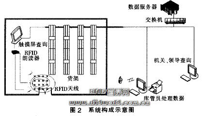 “衛(wèi)生戰(zhàn)備物資智能管理系統(tǒng)”由RFID采集、模擬倉庫觸摸屏查詢和業(yè)務(wù)管理(含RFID標(biāo)簽發(fā)行功能)等3個(gè)部分組成(如圖1、圖2所示)。這3個(gè)模塊互相聯(lián)系,集成為一個(gè)整體,共同完成物資管理的各個(gè)流程。業(yè)務(wù)管理模塊連接后臺(tái)數(shù)據(jù)庫是整個(gè)系統(tǒng)的核心.RFID采集與計(jì)算機(jī)模擬立體倉庫是實(shí)現(xiàn)管理功能的基礎(chǔ)和手段。