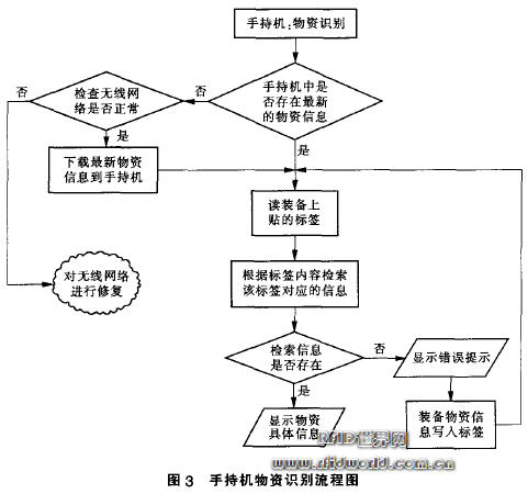 手持讀寫器可在小于1 m的距離非接觸識(shí)別物資.并在不開箱的情況下讀出物品箱內(nèi)物資的具體信息 手持機(jī)物資識(shí)別流程圖見圖3所示。