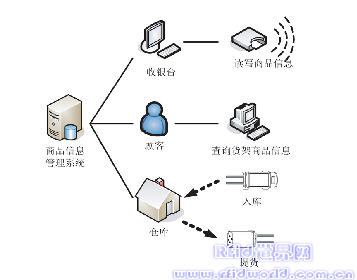 基于RFID技術的電子標簽能夠很好的滿足超市的這些需要。現(xiàn)將應用RFID技術的超市的構(gòu)架如下:超市主要分為倉庫、貨架、收銀區(qū)三個部分。普通遠距離讀卡器可靠讀出距離可達8m,則貨架的尺寸必須使得電子標簽能隨時處于讀卡器的讀取范圍之內(nèi)。每個讀卡器都與后臺負責管理的計算機相連。圖1這 三個區(qū)域所采取讀寫器是固定式的讀卡器。