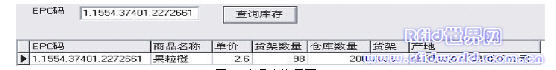 這是以一個64位的EPC代碼為例。所采集到的EPC傳送到超市的管理系統(tǒng)。將二進制的編碼轉(zhuǎn)換成十進制比較方便。例如下面便是查詢商品信息: