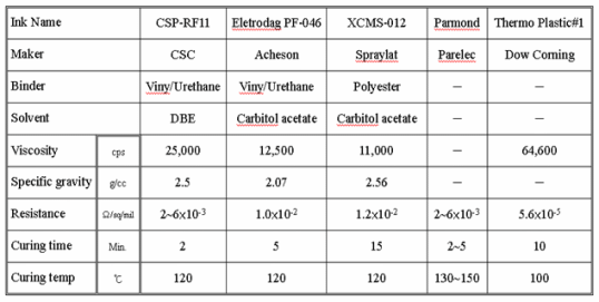 目前導電銀膠的供應商以美、歐廠商為主,亞洲則有日本及南韓廠商相爭,其油墨特性主要為銀粉成份,而銀粉成份的多寡決定其導電阻抗的特性。另外銀粉顆粒直徑的大小,亦是決定其印刷阻抗均一性的關鍵,表〔1〕為目前市面上幾種導電銀膠油墨的商品特性比較表,由表中可見干燥烘烤溫度及時間比一般印刷油墨高且長,新開發(fā)的導電銀膠特性則有朝向低溫快干低耗能及兼顧環(huán)保的趨勢。