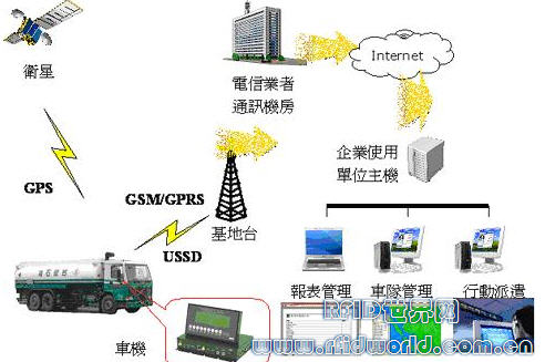 整合短距的無(wú)線射頻識(shí)別(RFID)技術(shù)與遠(yuǎn)距的無(wú)線定位與傳輸技術(shù),再加上地理信息系統(tǒng)(GIS)與產(chǎn)品管理(監(jiān)控)資料庫(kù),將形成一個(gè)智能型的動(dòng)態(tài)追蹤系統(tǒng)。手持式RFID Reader扮演的角色是提供貨品和人員的識(shí)別;車機(jī)則提供運(yùn)送地點(diǎn)的定位資料(經(jīng)度/緯度)并透過(guò)車機(jī)上的GSM/GPRS把以上資料傳送到后臺(tái)管理資料庫(kù);兩者之間可透過(guò)RS-232或Bluetooth等傳輸界面在車上進(jìn)行資料交換。
