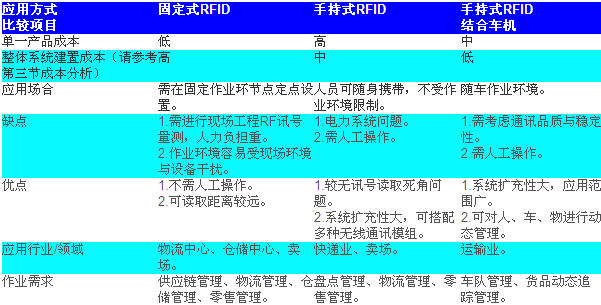 目前在供應(yīng)鏈中可能的做法大致有三種,固定式RFID Reader裝置在作業(yè)現(xiàn)場(chǎng);結(jié)合各種無(wú)線模組的手持式RFID Reader則配備在人員身上;第三種結(jié)合手持式RFID與車機(jī)隨車做貨物動(dòng)態(tài)追蹤,以下茲將三種方法的優(yōu)缺點(diǎn)做一比較: