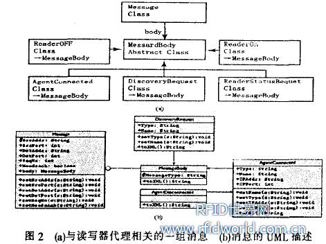 應用的快速開發(fā)具有重要的意義。文本使用XML消息[HI21來統(tǒng)一數(shù)據(jù)格式,在基于UDP/IP的網(wǎng)絡環(huán)境中進行通信。有效地解決了數(shù)據(jù)格式和通信協(xié)議不一致的問題圖2a為與讀寫器代理相關的一組消息.每種消息都包括消息頭和消息體兩部分,消息頭消息包含在Message類里面,相應的消息體信息則包含在MessageBody類里面。每種特定的消息都有對應的MessageBody派生子類與之對應。Message類和MessageBody類都包含一個toXML0方法(如圖2b所示)。用于將該消息轉換為對應的XML字符串.轉換后的XML字符串在網(wǎng)絡中進行傳輸,在接收代理接收該XML字符串后,該代理使用