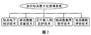 按照上述設(shè)計(jì)理念,油田鉆具數(shù)字化管理系統(tǒng)核心技術(shù)構(gòu)成如圖2,其核心技術(shù)包括:鉆具電子標(biāo)識(shí)技術(shù)、移動(dòng)數(shù)據(jù)采集技術(shù)、芯片植人和防護(hù)技術(shù)、鉆具數(shù)據(jù)庫(kù)軟件技術(shù)、鉆具跟蹤評(píng)價(jià)技術(shù)。
