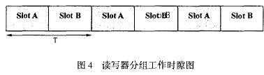 讓這兩組讀寫器分時(shí)工作,如圖4所示,假設(shè)工作周期是T ,把T分為兩個(gè)slot,兩組讀寫器分別工作在slot A和slot B。