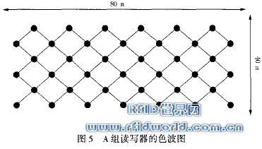 因?yàn)閮山M讀寫器有著相同的拓?fù)洌x寫器數(shù)目也相等,所以在接下去的討論中,只需對(duì)其中任意的一組進(jìn)行DCS色波算法的仿真,來(lái)觀察其性能。以 A組讀寫器為例,圖5是A組讀寫器的色波圖。