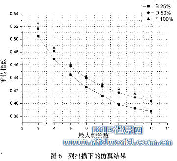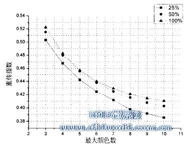 仿真的場(chǎng)景是一個(gè)大倉(cāng)庫(kù),里面整齊的排放著一列列貨架,倉(cāng)庫(kù)的長(zhǎng)寬為80m×40m,其中總共布置了78個(gè)讀寫器,每個(gè)讀寫器的讀寫半徑是4m,間隔是6m。所有讀寫器的總體讀寫范圍覆蓋了整個(gè)倉(cāng)庫(kù)平面。仿真時(shí)隨機(jī)產(chǎn)生各節(jié)點(diǎn)的起始顏色號(hào), 仿真過(guò)程中有4個(gè)參數(shù):最大顏色數(shù),傳輸概率,仿真周期和讀寫器掃描方式。最大顏色數(shù)范圍從3到l0,傳輸概率是指讀寫器和周圍的標(biāo)簽通信的概率, 選取這樣的幾組數(shù)值:25%,50%,75%,仿真周期是 一個(gè)常數(shù),表示仿真過(guò)程中讀寫器網(wǎng)絡(luò)的掃描總次數(shù),讀寫器掃描方式共有兩種,分別為行掃描和列掃描。這樣仿真總共有8×3×2=48組。為了盡量減少不同的起始值對(duì)仿真結(jié)果的影響,仿真周期選取盡量大,本文把他選為100,000。仿真程序用C++編寫,程序運(yùn)行的環(huán)境是Linux 2.6.11 i386 512M內(nèi)存。仿真運(yùn)行完成后觀察總的節(jié)點(diǎn)成功傳輸次數(shù)和總的節(jié)點(diǎn)失敗重傳次數(shù),計(jì)算出重傳指數(shù),重傳指數(shù)的定義如下: