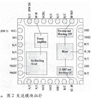 前置放大器和功率放大器之間外部互連到發(fā)送模塊這為設(shè)計(jì)人員提供最大靈活性。該點(diǎn)信號(hào)通路可以插入一個(gè)定制濾波器。有些用戶希望完全旁路混頻器,選擇用功率放大器的功率控制器電路引入數(shù)據(jù)調(diào)制。
