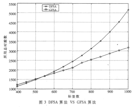 幀時(shí)隙ALOHA 算法局限于每幀最大時(shí)隙數(shù)為256。當(dāng)標(biāo)簽數(shù)遠(yuǎn)遠(yuǎn)大于256 時(shí), 系統(tǒng)無(wú)法通過(guò)增大時(shí)隙數(shù)來(lái)提高吞吐率。為解決這個(gè)問(wèn)題, 在DFSA 算法的基礎(chǔ)上提出分組幀時(shí)隙ALOHA 算法( GFSA) 。參考文獻(xiàn)[3]中說(shuō)明, 當(dāng)標(biāo)簽數(shù)多于354 時(shí)將全部標(biāo)簽分成兩組或者更多組, 讀寫(xiě)器分別對(duì)每組標(biāo)簽進(jìn)行識(shí)別, 從而可以很好地提高系統(tǒng)的吞吐率。圖3 為普通DFSA 算法與分組GFSA 算法在標(biāo)簽數(shù)多于400 時(shí)識(shí)別所用的總時(shí)隙數(shù)的比較, 初始時(shí)隙設(shè)為256。圖3 的結(jié)果表明, 標(biāo)簽數(shù)越多, 分組算法GFSA 的優(yōu)越性越明顯。但是這種算法需要在原有的DFSA 算法上做很多修改, 例如讀寫(xiě)器命令需要加入分組參數(shù), 標(biāo)簽需要確定并保存自己的分組序號(hào), 這使得實(shí)現(xiàn)變得有些困難。