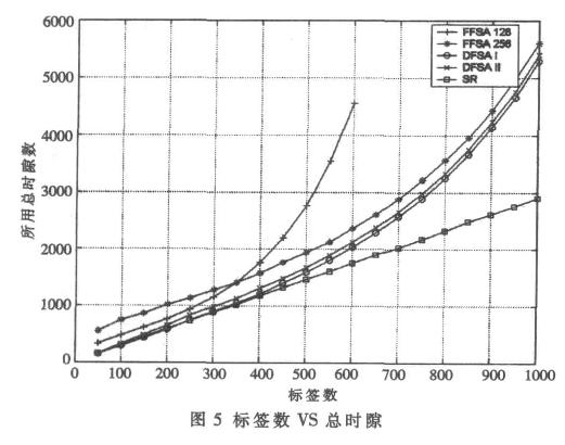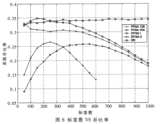 圖5、圖6 分別描述了識(shí)別一定數(shù)目的標(biāo)簽所需要的總時(shí)隙數(shù)和系統(tǒng)吞吐率。圖中, FFSA 128 和FFSA 256分別代表采用128 和256 時(shí)隙數(shù)的固定幀時(shí)隙ALOHA算法; DFSA I 和DFSA II 分別代表采用1.2 節(jié)第一種標(biāo)簽估計(jì)算法和第二種標(biāo)簽估計(jì)算法的動(dòng)態(tài)幀時(shí)隙ALOHA 算法; SR 算法代表時(shí)隙隨機(jī)算法, 其Q 值算法采用第2 節(jié)所述方法。