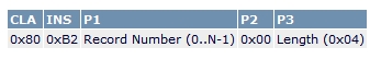 讀記錄命令可從當前所選文件的已識別記錄中讀取指定數(shù)量的字節(jié)。它是一個5字節(jié)命令,格式為: