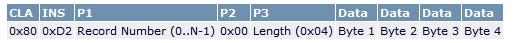 寫記錄命令可向當前所選文件的指定記錄寫入數(shù)據(jù)。該命令的長度可以隨著要寫入的字節(jié)數(shù)變化。在本實例中,每次都寫入4個字節(jié),因此該命令具有如下所示的格式: