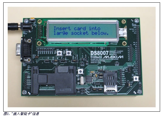 DS8007評估板出廠時已裝有本智能卡交易實例的軟件。若要驗證是否安裝了該軟件,可以給評估板通電然后觀察顯示屏。如果顯示屏上出現(xiàn)"在下面的大插槽中插入智能卡" (圖1),則表明已經(jīng)加載了程序。如果沒有顯示這條信息,則可通過MTK軟件將交易軟件裝載到板上的電池備份SRAM中。應(yīng)用筆記4036 (參看上文)說明了如何裝載應(yīng)用程序。要裝載的文件為Trans.hex,包含在AN4120_SW.zip中,可從上面提到的ftp網(wǎng)站下載。