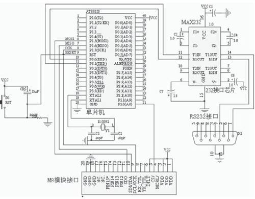 在本設計中控制模塊上需要留有一個接口,一方面與單片機的SPI引腳相連,另一方面通過導線與M8模塊通訊,這樣就實現(xiàn)了控制模塊與M8模塊的通訊。為了將所采集的標簽信息傳輸給上位計算機,可以使控制模塊與計算機之間通過串口通訊。控制模塊的電路原理圖如圖3所示。