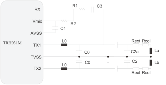 TRH031M的天線部分組成,主要分為發(fā)射和接收部分,發(fā)射部分又分為EMC低通濾波器,天線匹配部分和天線線圈。天線直接連接到TRH031M.,圖3為天線的結(jié)構(gòu)原理圖。