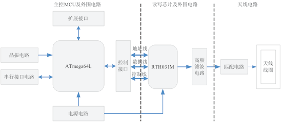 射頻讀寫芯片,負責接收主控MCU的控制信息并完成與RFID卡的通信操作。為了正常工作,射頻讀寫芯片須選用合適的并行接口與MCU連接。而為了發(fā)送、接收穩(wěn)定的高頻信號,射頻讀寫芯片要通過高頻濾波電路與天線部分連接。