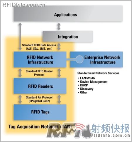 TAN架構(gòu)不是單獨建立RFID設(shè)施,而是將RFID并入企業(yè)的基礎(chǔ)設(shè)施和完備的標(biāo)準(zhǔn)中。它不是將RFID作為一項試驗,而是作為可在企業(yè)范圍內(nèi)得以應(yīng)用的全球性即插即用方案。通過將RFID技術(shù)集成到現(xiàn)有的網(wǎng)絡(luò),TAN架構(gòu)為RFID在主流市場定了位。