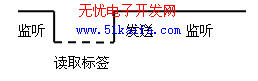 該模塊中提供的服務有兩個。其一,負責啟動讀寫器,讀取周圍的標簽信息,并將讀到的標簽存入PDA數(shù)據(jù)庫中緩存。其二,開啟Socket監(jiān)聽線程,啟動 TCP監(jiān)聽。負責TCP監(jiān)聽的守護程序在一個單獨的線程中運行。該線程主要負責建立TCP連接,打開TCP監(jiān)聽,當收到需要提供標簽信息的請求后,建立另一個線程,讀取標簽并使用已建立的TCP連接,將標簽信息返回給發(fā)出請求的機器。示意圖如下(實線為監(jiān)聽線程,虛線為讀取標簽線 )