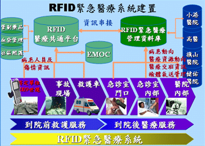 本案利用RFID來蒐集連續(xù)性的病患識(shí)別、定位和追蹤資料,現(xiàn)階段提供高雄市立小港醫(yī)院、旗山醫(yī)院、建佑醫(yī)院及高雄醫(yī)學(xué)大學(xué)附設(shè)中和紀(jì)念醫(yī)院之急診室,利用RFID緊急醫(yī)療系統(tǒng)將病患急診狀況自動(dòng)串接EMOC,以利EMOC值班人員隨時(shí)掌握傷情狀況,并即時(shí)通報(bào)行政院衛(wèi)生署等政府單位,徹底發(fā)揮醫(yī)療院所應(yīng)快速提供醫(yī)療資源之功能;同時(shí)和大型事業(yè)單位如小港機(jī)場(chǎng)結(jié)合,以滿足防疫或是急病處置的更高要求。結(jié)合RFID緊急醫(yī)療系統(tǒng)的建置,若有民眾在機(jī)場(chǎng)發(fā)生傷病,或是發(fā)生重大意外事故時(shí),就可以利用此系統(tǒng)增加責(zé)任醫(yī)院準(zhǔn)備的時(shí)間,以及應(yīng)付大量傷病患的能量。