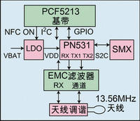 硬件NFC功能是通過(guò)2個(gè)芯片完成的(見(jiàn)圖2),即內(nèi)嵌固件的PN531 NFC控制器和飛利浦的SmartMX(SMX),SMX是一個(gè)智能卡雙接口安全控制器。SmartMX完全由PN531通過(guò)雙絞線S2C(信號(hào)輸入/輸出通信接口) 接口提供和控制。PN531反過(guò)來(lái)由基帶處理器通過(guò)I2C總線和2個(gè)用于握手的通用I/O(GPIOs)控制。天線電路一分為二,即EMC濾波+RX路徑和天線調(diào)諧,因此可以自由選擇在何處設(shè)置非接觸天線(目前設(shè)置在專(zhuān)用的電池包中)。另外一個(gè)GPIO用于控制提供NFC電源的LDO(低壓降線性調(diào)節(jié)器)。