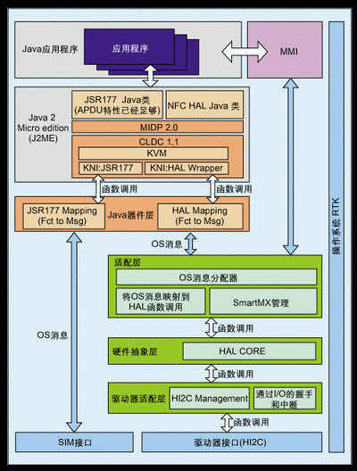 圖3是軟件系統(tǒng)實(shí)現(xiàn)框圖。在Sy.Sol 6100軟件中已經(jīng)增加了特定的模塊,這些模塊與不同應(yīng)用中許多可能的數(shù)據(jù)流相兼容,并與目前的Nexperia軟件堆棧兼容。這些模塊包括:帶有到應(yīng)用程序和I2C驅(qū)動(dòng)程序自適應(yīng)層的硬件抽象層;此外,SmartMX由一個(gè)特定的模塊管理;與J2ME棧接口以及與SIM卡進(jìn)行交互的Java器件層。