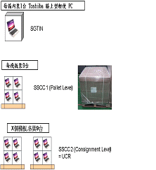 第二階段測(cè)試計(jì)劃規(guī)劃航空運(yùn)送貨物RFID使用關(guān)鍵性識(shí)別碼包括有SGTIN、SSCC、GRAI,場(chǎng)所與參與者識(shí)別是使用GLN,以下圖例說(shuō)明貨物于不同包裝層級(jí)架構(gòu)之下所使用的數(shù)據(jù)識(shí)別碼-