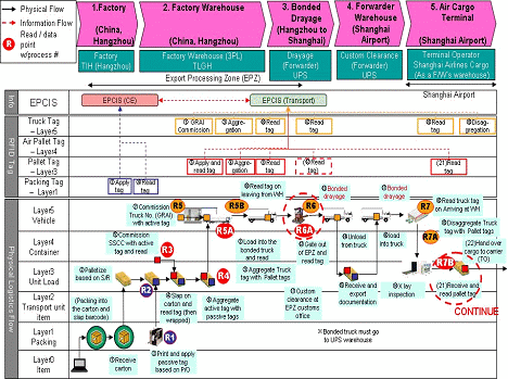 EPCglobal產(chǎn)業(yè)行動(dòng)小組(Industry Action Group)之下運(yùn)輸物流服務(wù)全球先導(dǎo)工作小組(TLS Global Pilot Task Group),希望透過(guò)跨國(guó)、跨產(chǎn)業(yè)合作模式,來(lái)協(xié)助各國(guó)有興趣產(chǎn)業(yè)導(dǎo)入使用EPC/RFID相關(guān)標(biāo)準(zhǔn),驗(yàn)證GS1 識(shí)別標(biāo)準(zhǔn)、EPC/RFID技術(shù)組件與EPCIS系統(tǒng)應(yīng)用可行性。從2006年開(kāi)始規(guī)劃三階段Pilot計(jì)劃,2007年2月完成Pilot第一階段測(cè)試作業(yè),作業(yè)范圍是從香港貨物拼裝中心(貨棧)到日本港之海運(yùn)整柜貨物運(yùn)輸導(dǎo)入EPC/RFID測(cè)試;第二階段擴(kuò)大作業(yè)范圍即貨物運(yùn)送由中國(guó)托運(yùn)人杭州倉(cāng)儲(chǔ)出發(fā),送至中國(guó)上海機(jī)場(chǎng)至美國(guó)長(zhǎng)堤收件人倉(cāng)儲(chǔ),中間于日本Narita機(jī)場(chǎng)轉(zhuǎn)運(yùn)之空運(yùn)拼裝柜運(yùn)輸導(dǎo)入EPC/RFID測(cè)試,也于今年(2008)2月完成整個(gè)Pilot計(jì)劃測(cè)試作業(yè),耗資超過(guò)1百40萬(wàn)美金。以下針對(duì)第二階段Pilot計(jì)劃執(zhí)行過(guò)程作一摘要介紹。